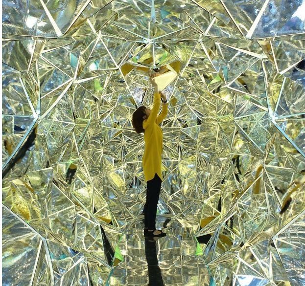 Cette installation des plus visuelle est composée de nombreuses feuilles miroir pliées comme de l’origami de façon polygonale pour permettre à l’œil de se perdre et aux formes de se (dé)composer. Les 1100 panneaux triangulaires réfléchissantes sont connectées les uns aux autres par des fermetures éclair. De cette façon, la pièce psychédélique est interactive et interchangeable à volonté !