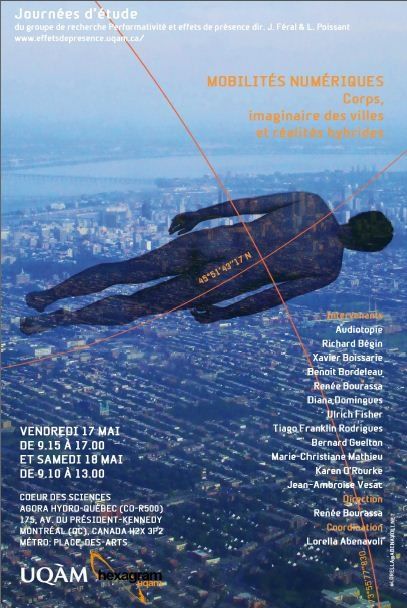Le groupe de recherche Performativité et effets de présence, sous la co-direction de Josette Féral et Louise Poissant, mène une réflexion depuis plusieurs années sur les mutations des pratiques performatives engendrées par leur rencontre avec les pratiques médiatiques. Dans le cadre de ces activités, les 17 et 18 mai 2013, deux journées d’étude organisées par Renée Bourassa et Lorella Abenavoli seront consacrées aux mobilités numériques dans leurs relations à la corporéité et à l’imaginaire des villes, porteurs de réalités hybrides.